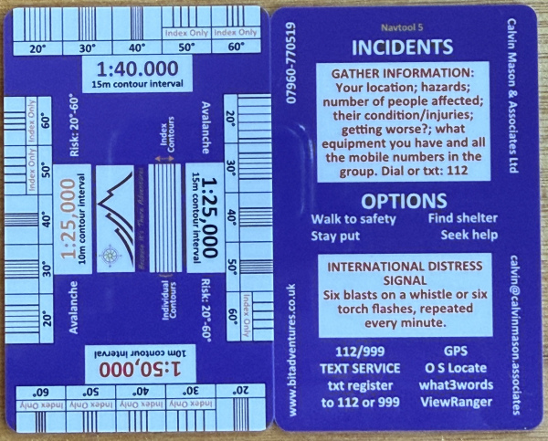 Navtool 5: Contour gauge for slopes at 20, 30, 40, 50 & 60 degrees which are the avalanche risk areas. These are in 3 scales (1:25,000, 1:40,000 and 1:50,000 and cover contour intervals of 10m (1:25,000 & 1:50,000) and 15m (1:25000 & 1:40,000). It also has some things to consider when dealing with an incident.